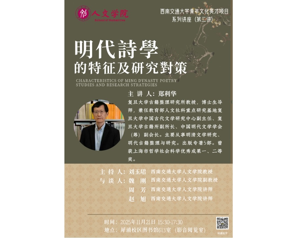 主讲人:复旦大学古籍整理研究所 郑利华教授讲座时间:2025年11月21日 15:30-17:30讲座地点:犀浦校区图书馆613室(影音阅览室)主办单位:必赢线路检测3003主持人:必赢线路检测3003 刘玉珺教授主讲人介绍:郑利华,复旦大学古籍整理研究所教授,博士生导师,兼任教育部人文社科重点研究基地复旦大学中国古代文学研究中心副主任、复旦大学古籍所副所长、中国明代文学学会(筹)副会长。主要从事明清文学研究、明代古籍整理与研究。...