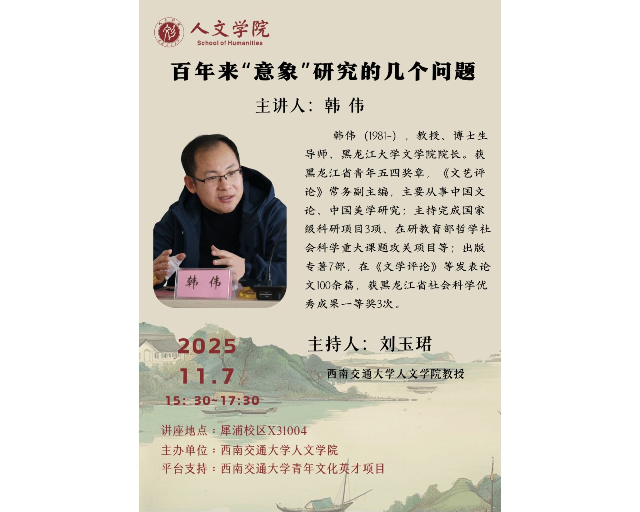 主讲人:黑龙江大学文学院院长 韩伟教授讲座时间:2025年11月7日 15:30-17:30讲座地点:犀浦校区X31004会议室 主办单位:必赢线路检测3003主持人:必赢线路检测3003 刘玉珺教授主讲人介绍:韩伟(1981—),教授、博士生导师、黑龙江大学文学院院长。多次入选国家级青年人才计划,获黑龙江省青年五四奖章,《文艺评论》常务副主编,主要从事中国文论、中国美学研究;主持完成国家级科研项目3项、在研教育部哲学社会科学重大课题攻关项目等;...