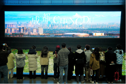在规划馆工作人员的引导下,研学团队依次参观场馆各功能展区,开启分层探索之旅。在一层展区,师生们聚焦“九天成都”数字活化装置,通过动态影像与交互技术,直观了解成都从古至今的历史发展成就,感受城市在文化传承与时代发展中的独特轨迹。