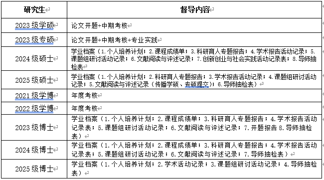 2.校级研究生培养质量督导组将结合《2025年度研究生培养质量自查工作相关安排》,对学院《研究生培养单位关于过程质量自查工作的总结报告》进行全面检查。