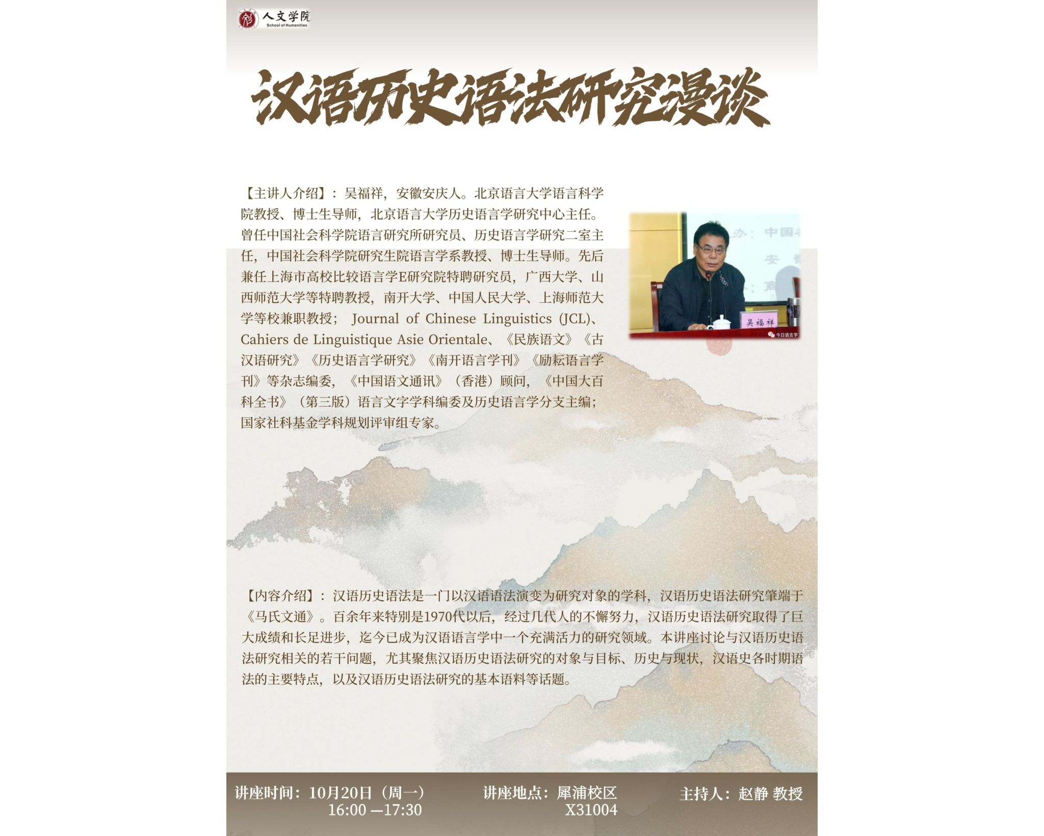 主讲人:北京语言大学语言科学院 吴福祥教授讲座时间:2025年10月20日(周一) 16:00-17:30讲座地点:犀浦校区X31004会议室主办单位:必赢线路检测3003主持人:必赢线路检测3003 赵静教授