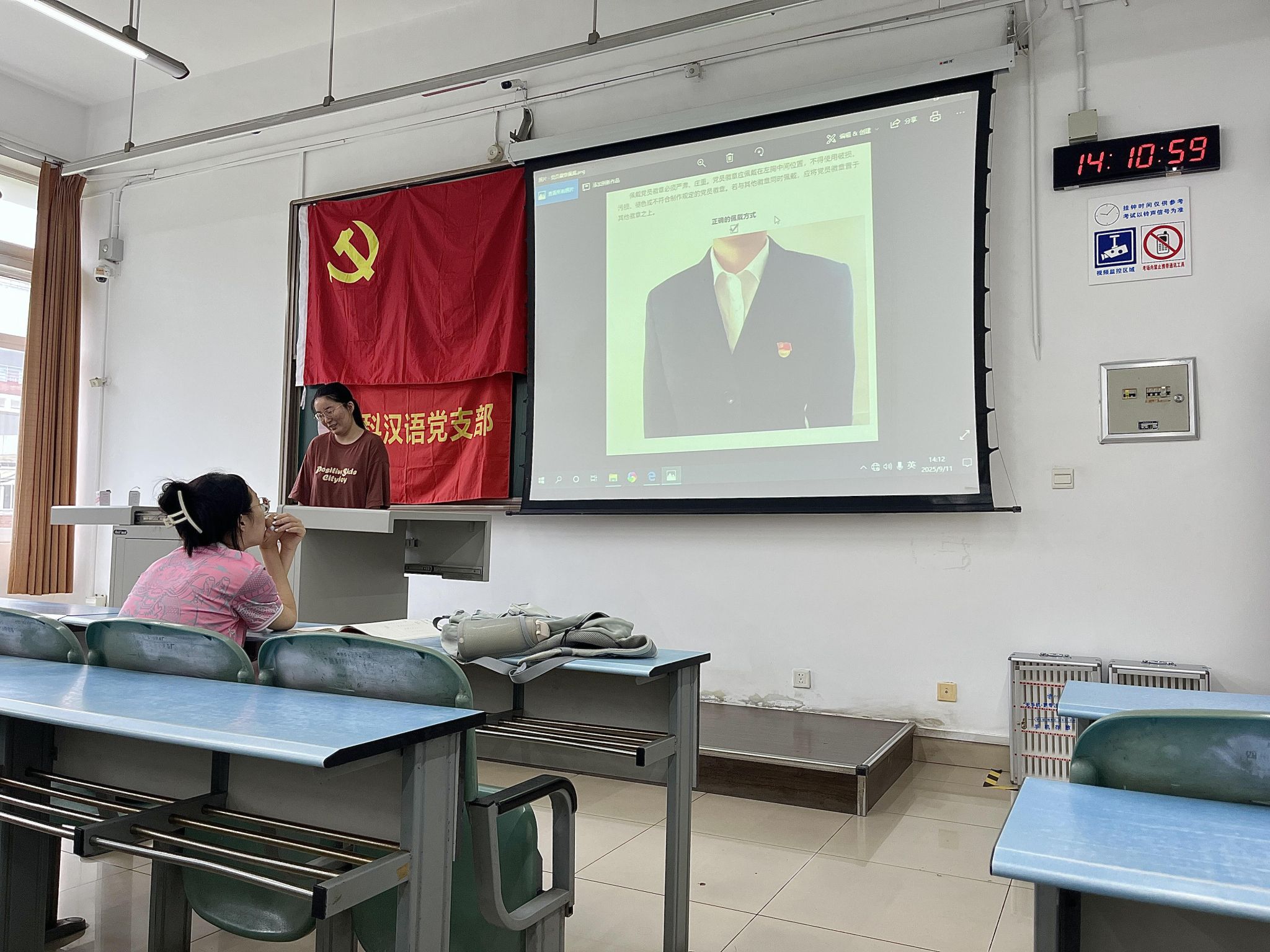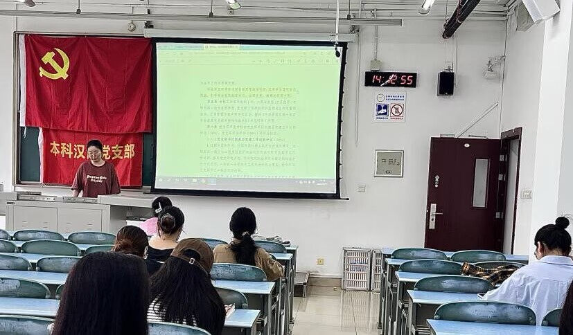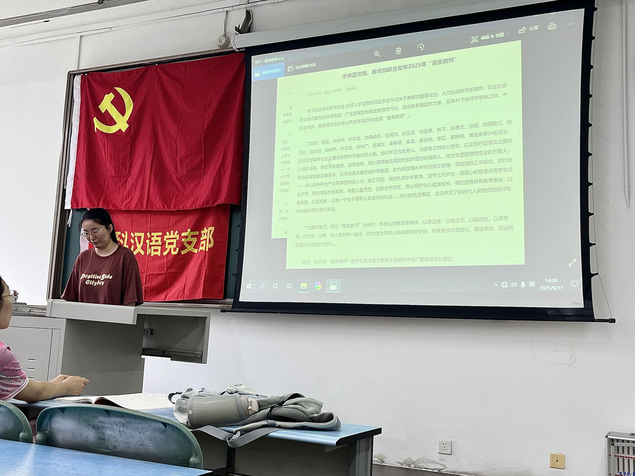 2025年9月11日下午,必赢线路检测3003本科汉语党支部在犀浦校区X2326开展9月主题党日活动。主要学习内容有:习近平总书记在纪念中国人民抗日战争暨世界反法西斯战争胜利80周年大会上的重要讲话、2025年全国“最美教师”先进事迹、《中国共产党党徽党旗条例》以及《基层党支部工作考核办法》。本次活动由邓丹黎同志主持。